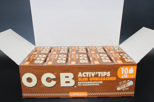 OCB Active Tips Slim Unbleached à 50 „Aktivkohlefilter mit Keramikkappen" Display