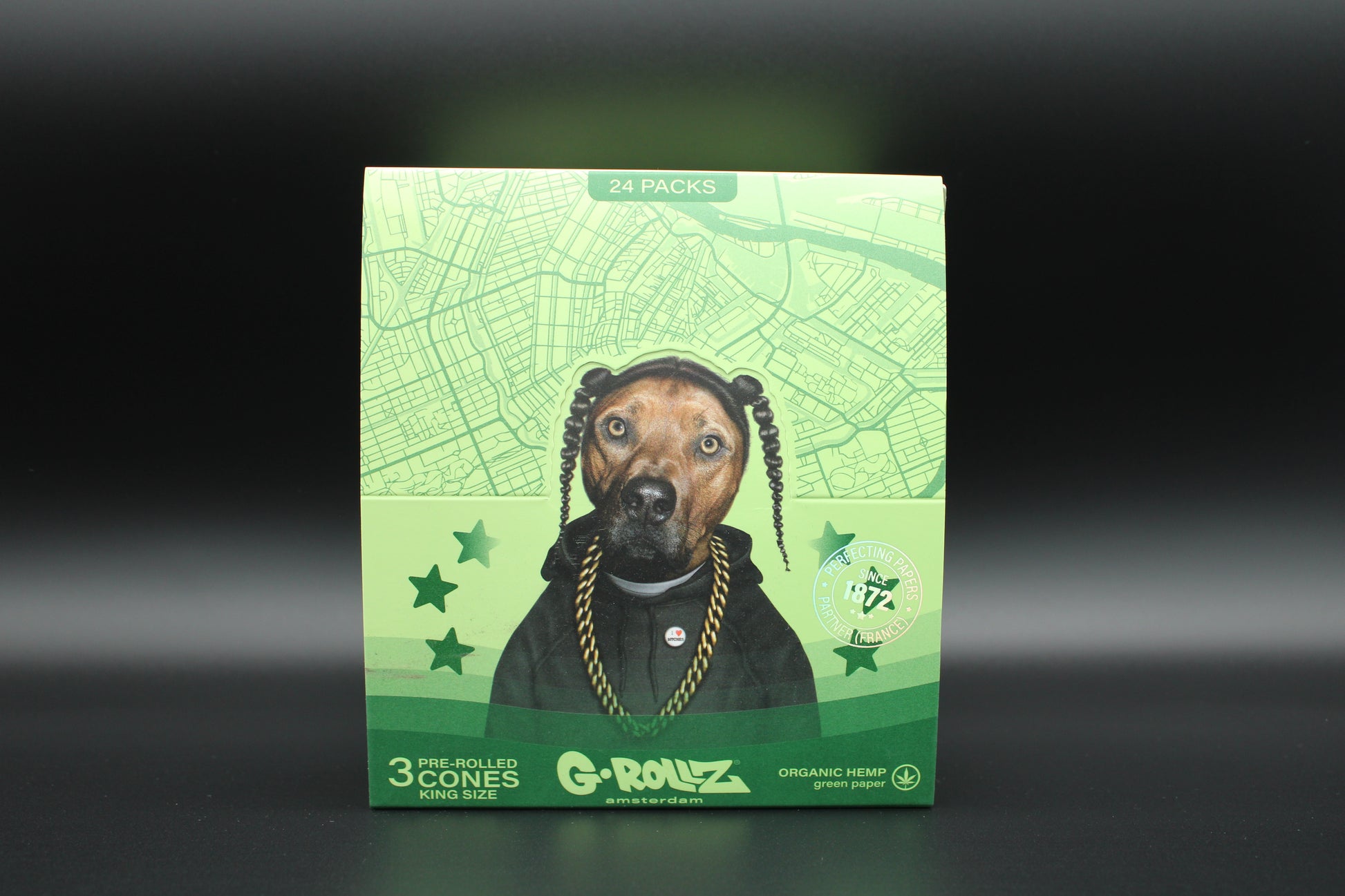 Das verkaufsfertige Display enthält 24 Packungen G-Rollz Dog Green Hemp King-Size Cones, jeweils mit vorgedrehten Cones für schnelles und unkompliziertes Befüllen.